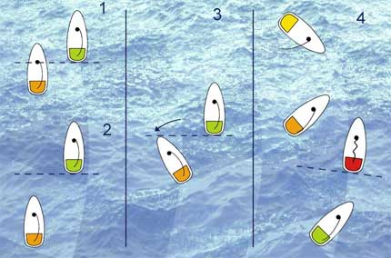 4 - Le bateau jaune est engagé par rapport au bateau rouge car il se trouve au-dessus de la limite perpendiculaire à l'arrière du bateau rouge et est à moins de 2 longueurs de coque de celui-ci. Le bateau orange est engagé par rapport au bateau rouge.Le bateau vert est en route libre derrière le bateau rouge.